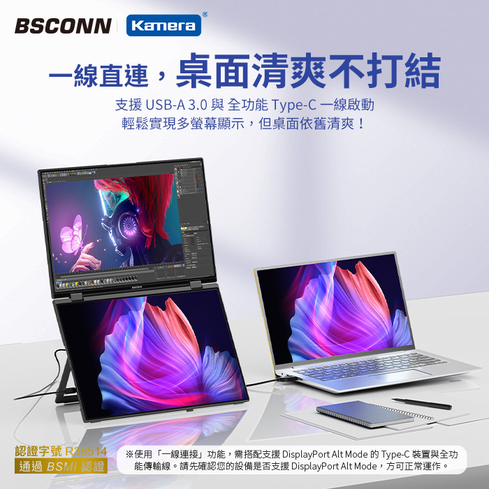 - 搭載DisplayLink 技術,一線啟動雙螢模式,讓桌面更簡潔乾淨。支援 USB-A / Type-C 全功能連接,啟動雙螢幕擴展顯示,簡單易用。
