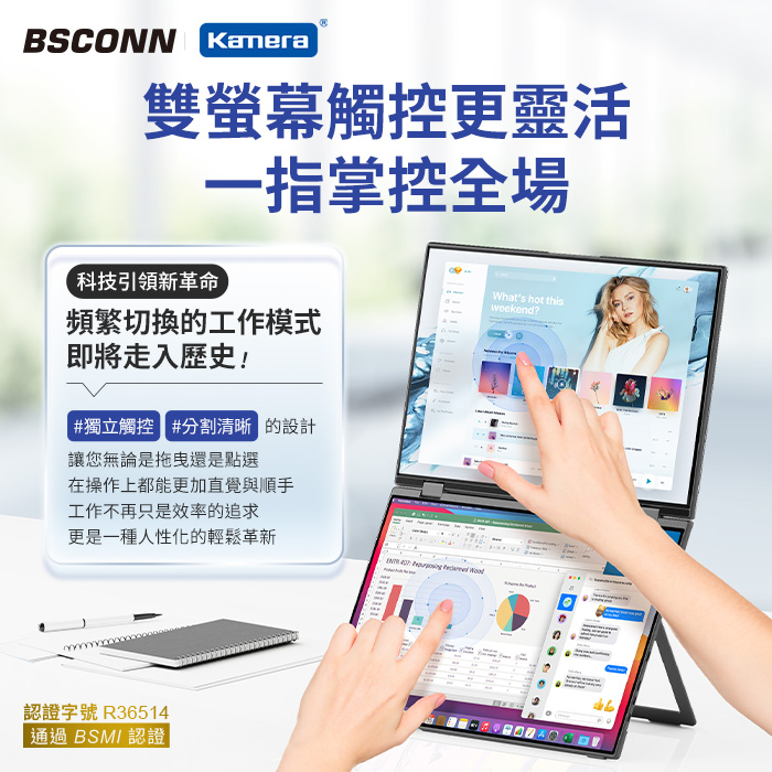 - 一台摺疊螢幕,改變你的操作習慣。上下雙螢幕可獨立操作,互不干擾,不需要再滑鼠狂切畫面,讓你一邊簡報、一邊瀏覽資料;剪片、寫程式、報表編輯效率翻倍。不是只能辦公,也能隨時開玩。相較傳統外接螢幕,加入觸控功能,大幅降低滑鼠操作頻率,實現更直覺、多工的使用體驗。
