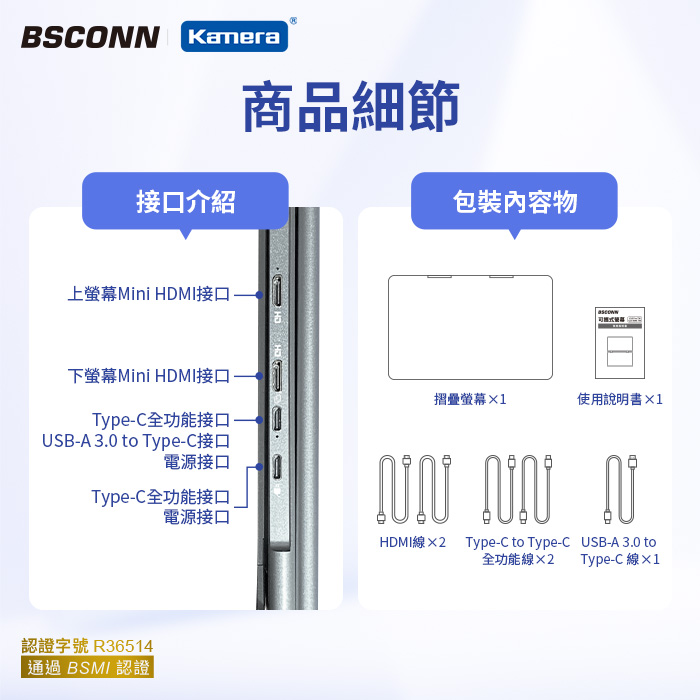 摺疊螢幕×1、HDMI線×2、Type-C to Type-C線×2、USB-A 3.0 to Type-C線×1、使用說明書×1