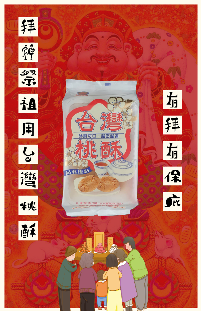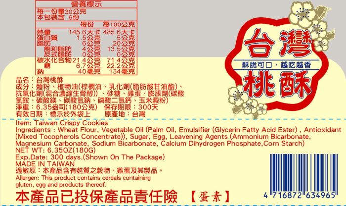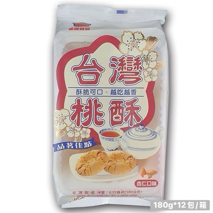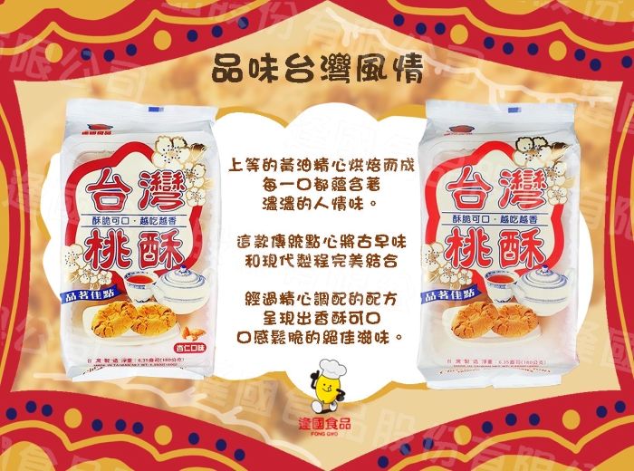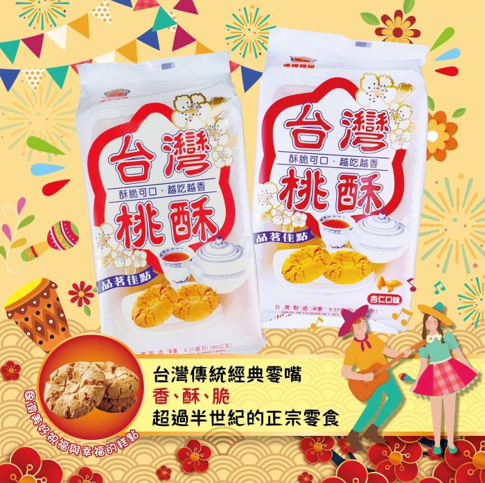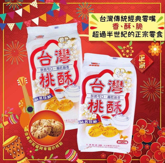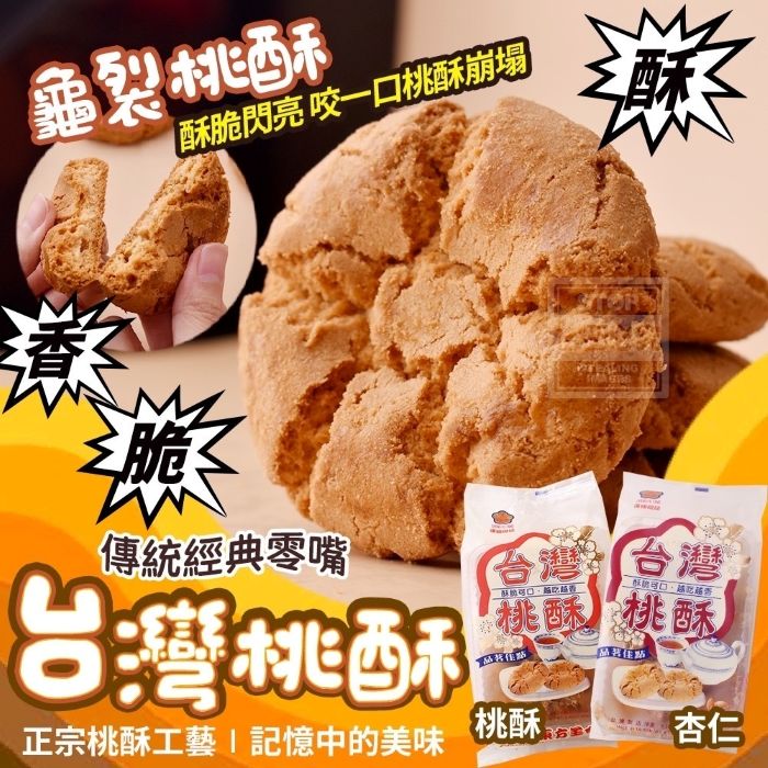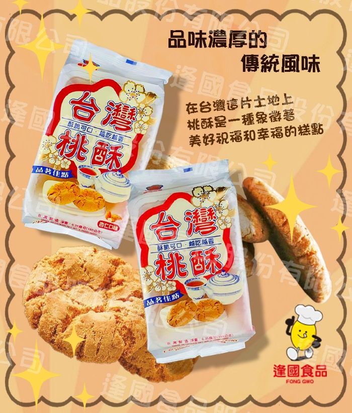 產品特點: 傳統風味:台灣桃酥延續了台灣經典的烘焙技術,每一口都充滿著台灣古早味。 食材天然:選用優質的麵粉、糖和天然植物油製作,不含防腐劑和人工添加物。