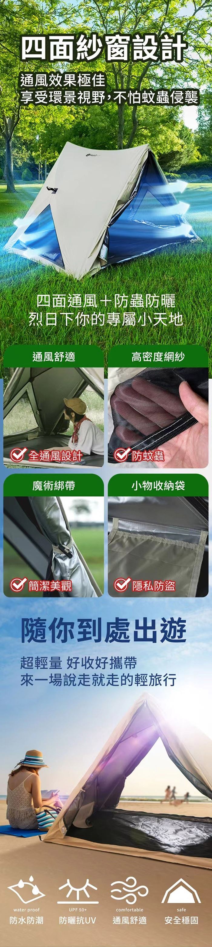 | 【材質或成分】 | 外帳材質 : PU2000mm防潑水牛津布+高密度網紗 帳底材質 : 210D防水牛津布 防水指數 : 2000mm+ |