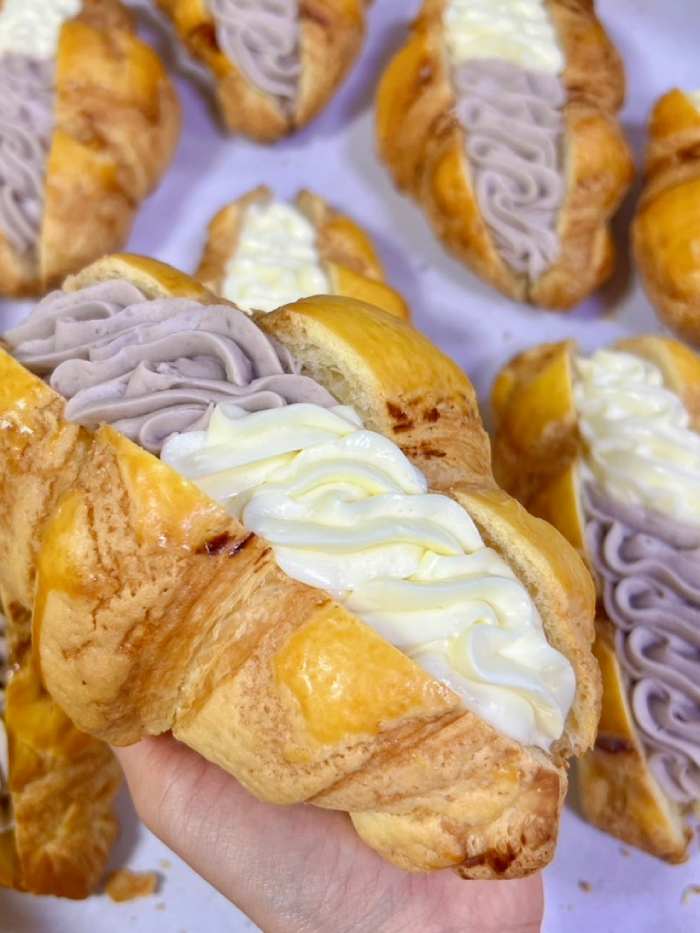 菠蘿酥皮可頌酥香中帶一點脆,綿密芋泥生乳與獨特起司白醬內餡
