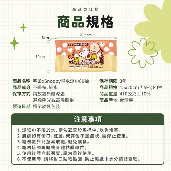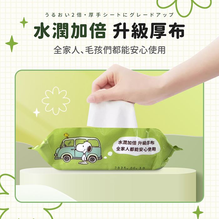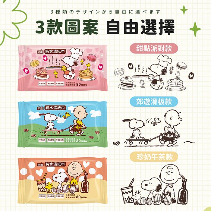 | 商品名稱 | 【箱購】《芊柔xSnoopy》純水濕紙巾(80抽x12包)-3款可選 | |