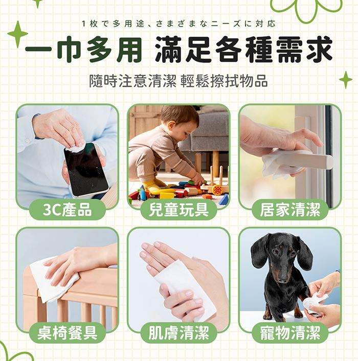 | 注意事項 | ※濕紙巾不溶於水,請勿丟棄於馬桶中,以免堵塞。 ※肌膚如有傷口、紅腫,或其他不適症狀,請停止使用。 ※請勿置於兒童一取處,避免誤食。 ※請勿接觸眼睛或身體黏膜部位。 ※使用後請立即丟棄,請勿重複使用。 ※不使用時,請將封口貼紙貼回,防止濕紙巾水分蒸發變乾。 ※商品尺寸皆為手工測量,可能有些許誤差,請以實際收到商品為準。 ※商品顏色可能因環境光線、螢幕顯色的不同而有些許色差,請以實際收到商品為準。 |