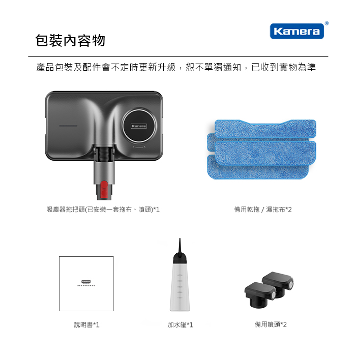 | 內容物 | 拖把頭x1、注水壺、拖把布1組、說明書 |