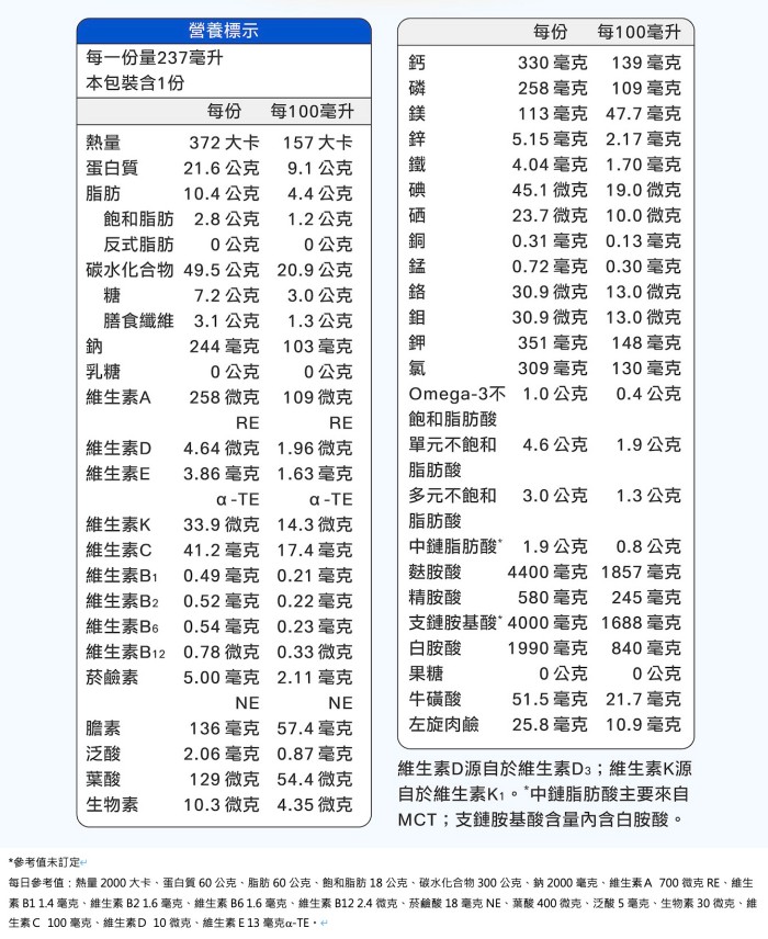 逆滲透水、麥芽糊精、分離牛奶蛋白[含支鏈胺基酸、麩(醯)胺酸、精胺酸]、酪蛋白鈉、蔗糖、芥花油、濃縮乳清蛋白[含支鏈胺基酸、麩(醯)胺酸、精胺酸]、異麥芽酮糖、果寡醣、中鏈三酸甘油酯(MCT)、亞麻仁油、紅花籽油、氯化鉀、綜合礦物質[磷酸鈣、氧化鎂、麥芽糊精、硫酸鋅、硒酸鈉(麥芽糊精、硒酸鈉)、硫酸錳、三氯化鉻(麥芽糊精、三氯化鉻、檸檬酸)、硫酸銅、碘化鉀(麥芽糊精、碘化鉀)、鉬酸鈉]、香料、檸檬酸、脂肪酸甘油酯、卵磷脂(源自於大豆)、氯化膽鹼、脂肪酸蔗糖酯、多磷酸鈉、維生素C(抗壞血酸鈉)、檸檬酸鉀、磷酸鈣、氯化鈉、DHA藻油[life’sDHAR,DHA藻油、葵花油、維生素E(抗氧化劑)、卵磷脂(源自葵花)、L-抗壞血酸棕櫚酸酯(抗氧化劑)]、牛磺酸、氧化鎂、L-肉酸、硫酸亞鐵、矽樹脂(矽樹脂、脂肪酸山梨醇酐酯、聚山梨醇酐脂肪酸酯六十五、羧甲基纖維素鈉、水)、維生素A[維生素A粉末、維生素E(抗氧化劑)、玉米澱粉、阿拉伯膠、麥芽糊精]、維生素E(乙酸dl-α-生育醇酯、麥芽糊精、辛烯基丁二酸鈉澱粉、二氧化矽)、菸鹼醯胺、維生素B1(鹽酸硫胺明)、泛酸鈣、維生素D3[辛烯基丁二酸鈉澱粉、蔗糖、L-抗壞血酸鈉(抗氧化劑)、中鏈三酸甘油酯、二氧化矽、維生素E(抗氧化劑)、膽鈣化醇]、硫酸錳、維生素B12(麥芽糊精、檸檬酸鈉、檸檬酸、氰鈷胺明)、維生素K1(阿拉伯膠、維生素K1、蔗糖)、維生素B2(核黃素)、維生素B6(鹽酸?哆辛)、葉酸、生物素。 |