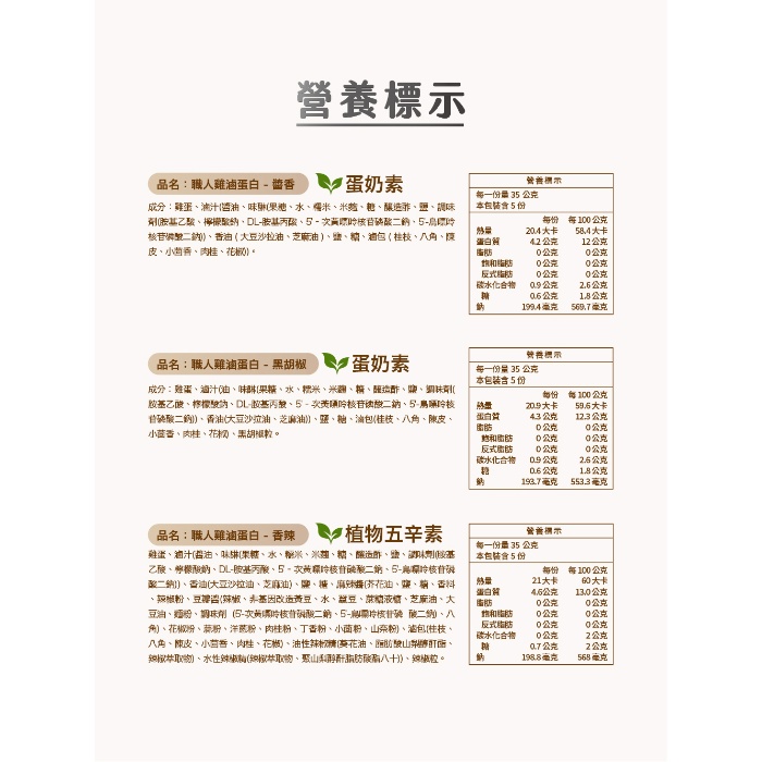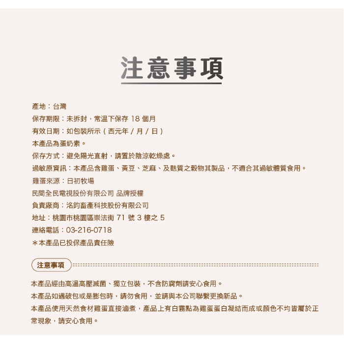 | 過敏原資訊 | 本產品含雞蛋、黃豆、芝麻、及麩質之穀物其製品,不適合其過敏體質食用。 |