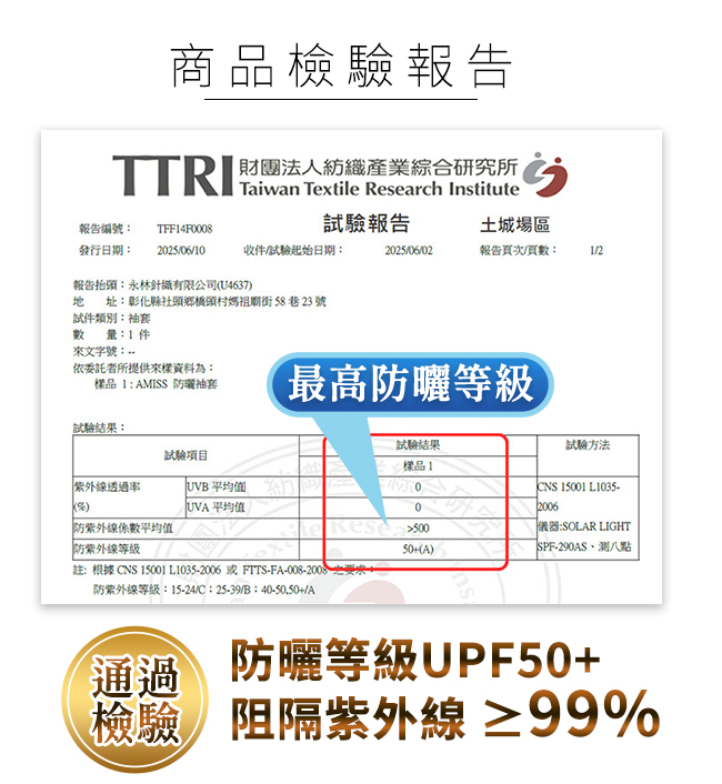 通過檢驗-防曬等級UPF50+,阻隔紫外線≥99%