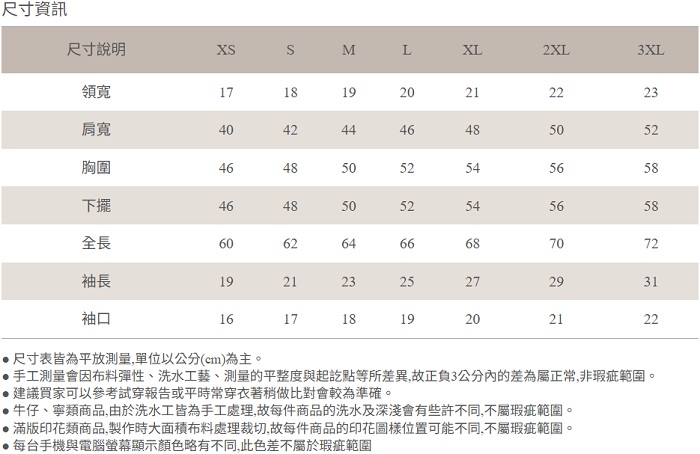 ♦尺寸表(CM) XS 領寬17/肩寬40/胸圍46/下襬46/全長60/袖長19/袖口16 ● 手工測量會因布料彈性、洗水工藝、測量的平整度與起訖點等所差異,故正負3公分內的差為屬正常,非瑕疵範圍。 |