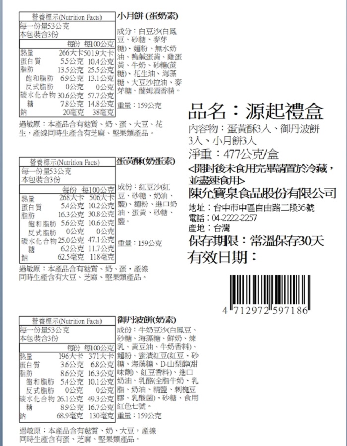 | 商品名稱 | 【陳允寶泉】源起禮盒4盒(小月餅x3+御丹波x3+蛋黃酥x3/盒) |