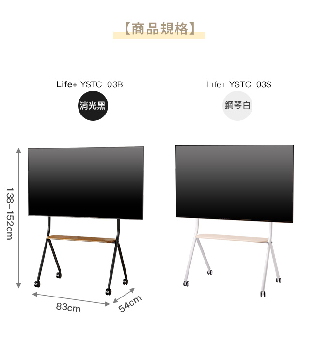 產品款式顏色:Life+ YSTC-03B消光黑、Life+ YSTC-03S鋼琴白 適用尺寸:32 ~75吋電視 電視孔距:100*100mm~600*600mm(橫向*縱向) 最大承重: 約60kg |