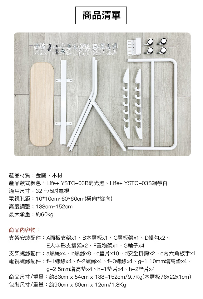 | 內容物 | 支架安裝配件:A面板支架x1、B木層板x1、C層板架x1、D掛勾x2、E人字形支撐架x2、F置物架x1、G輪子x4 支架螺絲配件:a螺絲x4、b螺絲x8、c墊片x10、d安全掛鉤x2、e內六角板手x1 電視螺絲配件:f-1螺絲x4、f-2螺絲x4、f-3螺絲x4、g-1 10mm增高墊x4、g-2 5mm增高墊x4、h-1墊片x4、h-2墊片x4 |