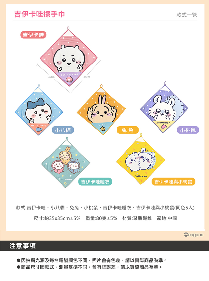 | 商品名稱 | 【吉伊卡哇】方型擦手巾五入組 |