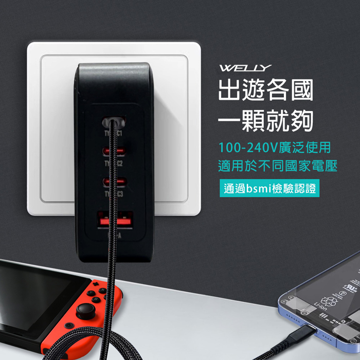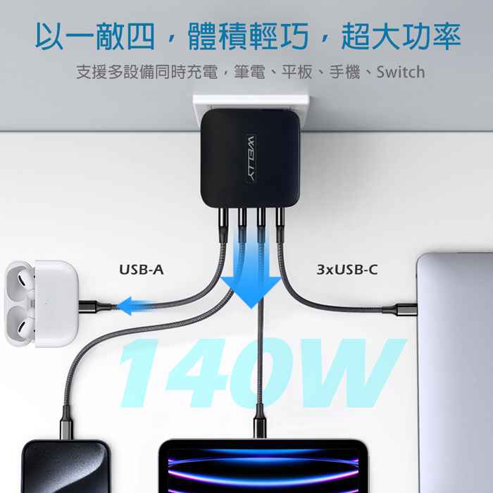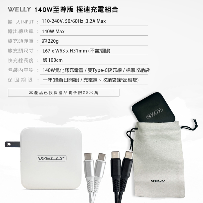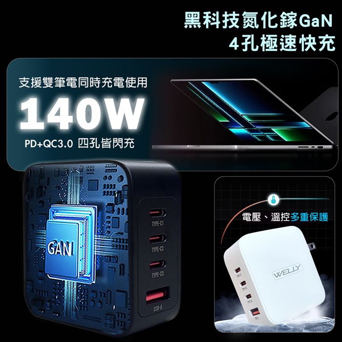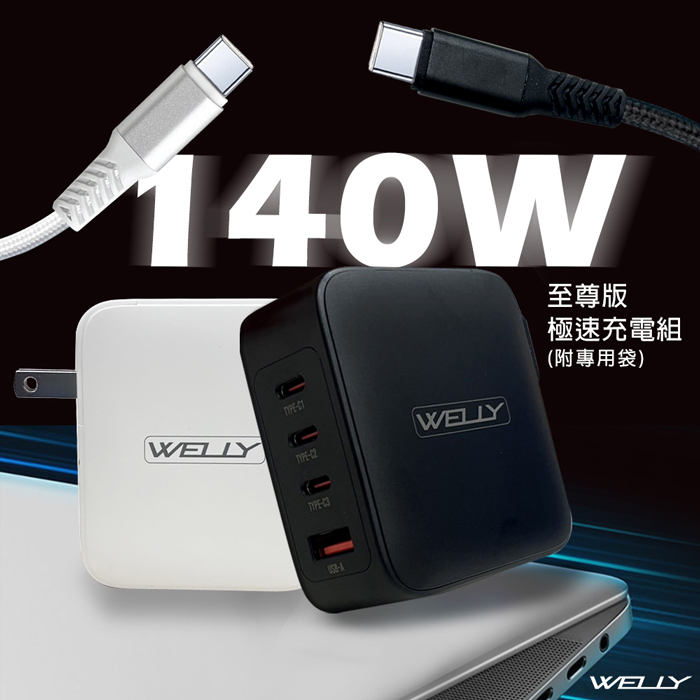 | 商品名稱 | WELLY 140W氮化鎵GaN 至尊版 四孔輸出極速充電組合包 附收納袋 |