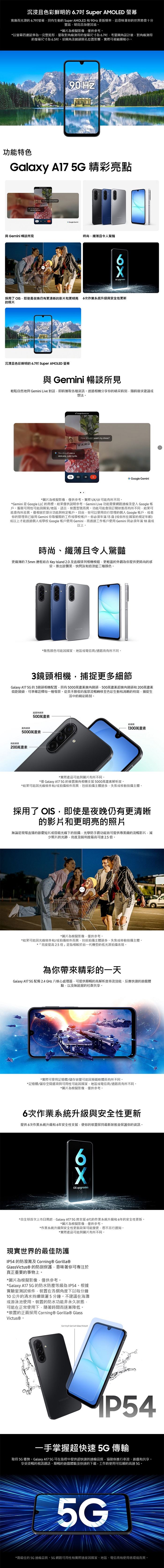 | 商品名稱 | Samsung Galaxy A17 6G/128G 6.7吋 5G 智慧型手機 |