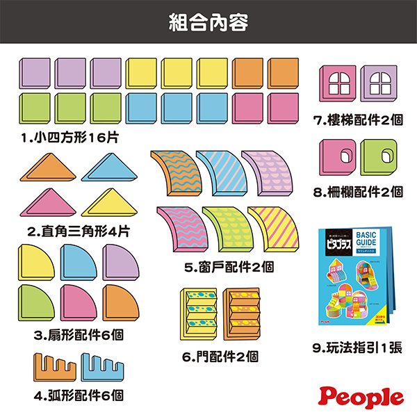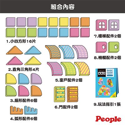 | 內容物 | 1.小四方形16片;2.直角三角形4片;3.扇形配件6個;4.弧形配件6個;5.窗戶配件2個;6.門配件2個;7.樓梯配件2個;8.柵欄配件2個;9.玩法指引1張。 |