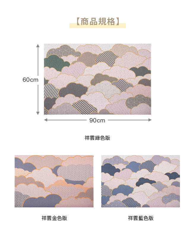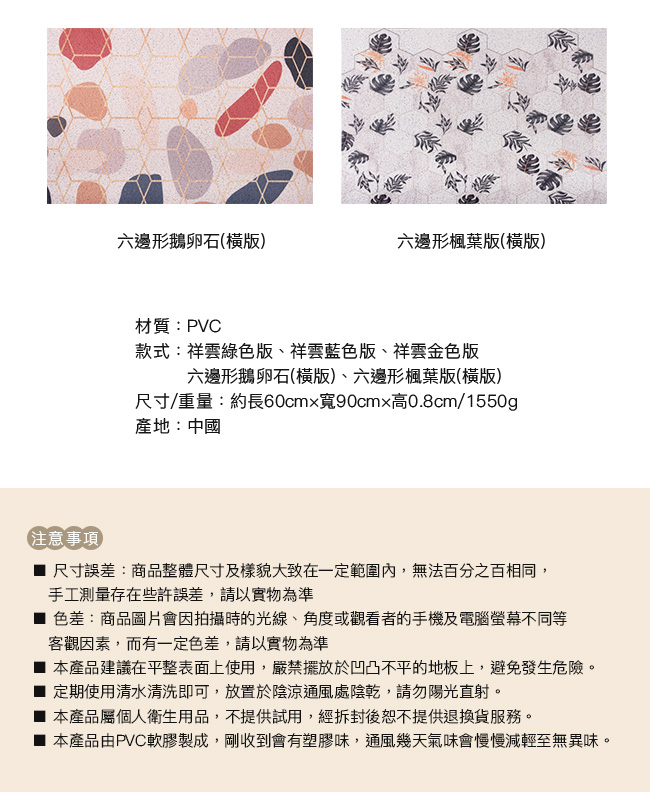 | 包裝內容/商品規格 | 款式:祥雲綠色版、祥雲藍色版、祥雲金色版、六邊形鵝卵石(橫版)、六邊形楓葉版(橫版) 尺寸/重量:約長60cm×寬90cm×高0.8cm/1550g |