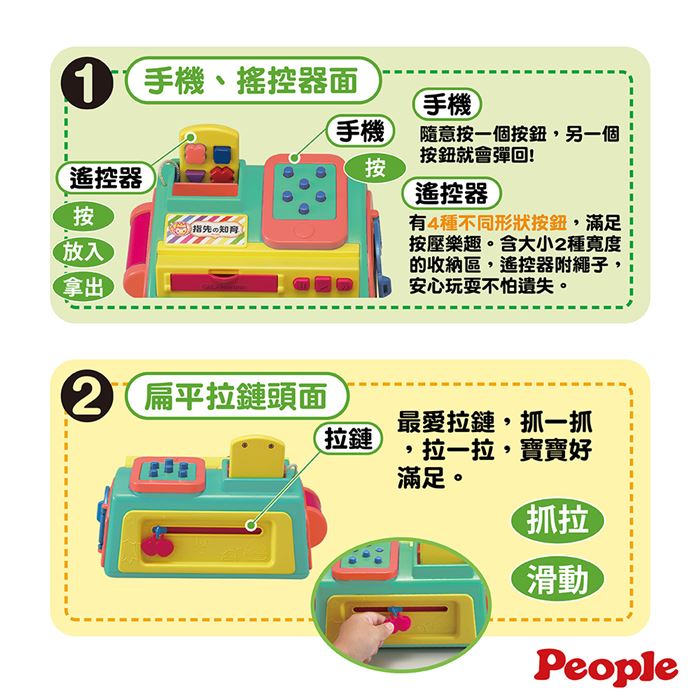 搖控器:有4種不同形狀按鈕,滿足按壓樂趣。含大小2種寬度的收納區,從小學習收納好習慣!