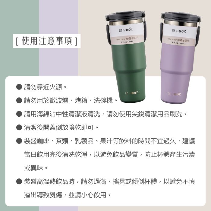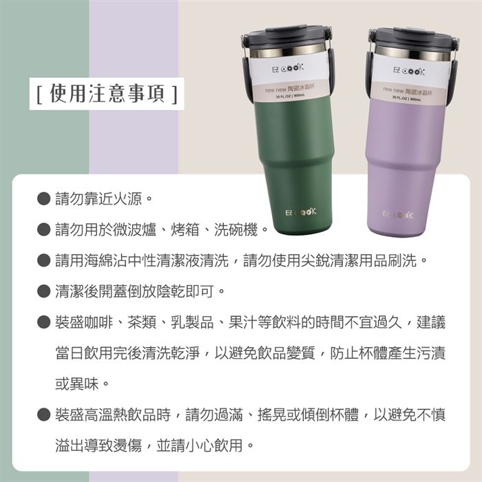 | 注意事項 | ※請勿靠近火源 ※請勿用於微波爐、烤箱、洗碗機 ※保溫/保冰效果會因環境/使用方式而有所不同 ※請用海綿中性清潔液清洗,請勿使用尖銳清潔用品刷洗,清潔後開蓋倒放陰乾即可 ※裝盛咖啡、茶類、乳製品、果汁等飲料的時間不宜過久,建議當日飲用完後清洗乾淨,以避免飲品變質,防止杯體產生污漬或異味 ※裝盛高溫熱飲品時,請勿過滿、搖晃或傾倒杯體,以避免不慎溢出導致燙傷,並請小心飲用 |