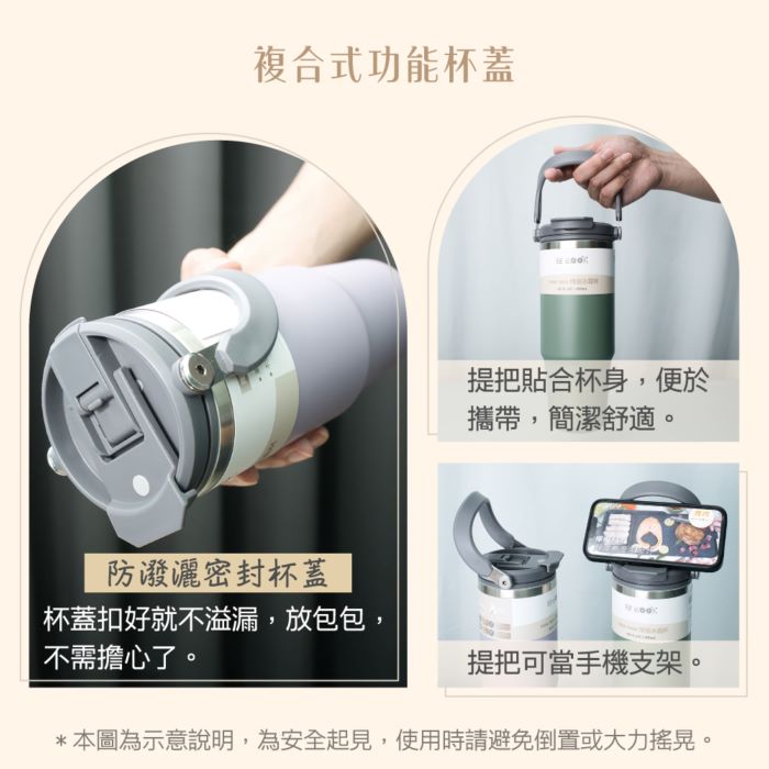 防潑灑杯蓋,直飲口、吸管嘴雙用,提把便攜設計