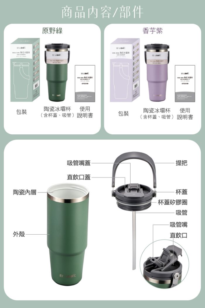 | 成分 | 304不鏽鋼-內膽、外殼&陶瓷釉表層-杯內&PP(聚丙烯)-杯蓋&矽膠-矽膠圈&杯蓋吸管-PET(聚對苯二甲酸乙二酯)&SUS304-提把&PC-杯內吸管 |
