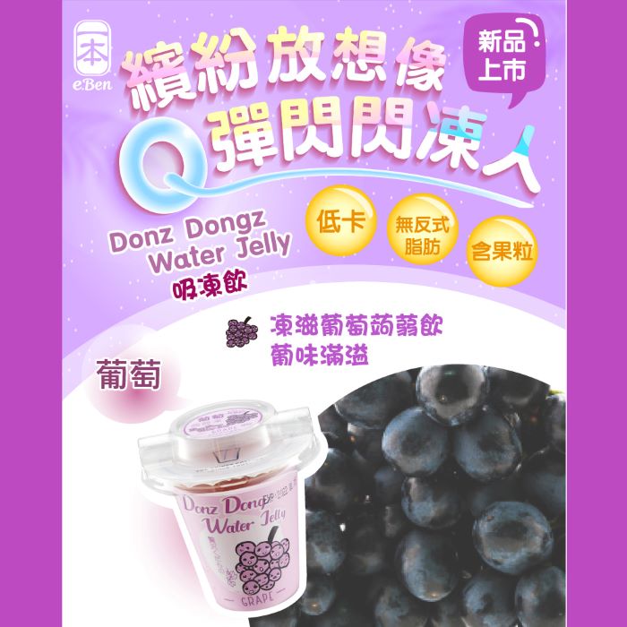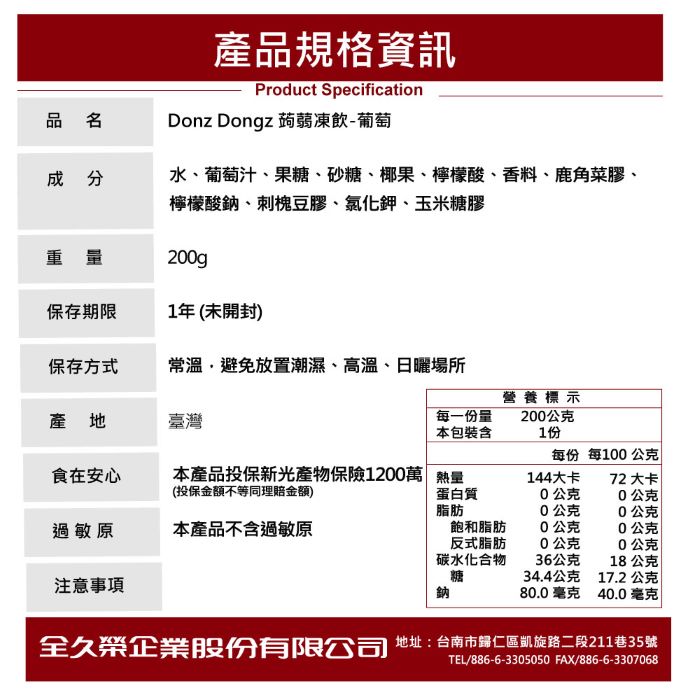| 包裝內容/商品規格 | 水、葡萄原汁、椰果、果糖、砂糖、檸檬酸、香料、檸檬酸鈉、鹿角菜膠、氧化鉀、蒟蒻粉、玉米糖膠、刺槐豆膠 |