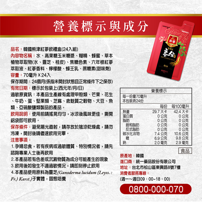 | 商品名稱 | (買一送一)韓國熊津紅蔘飲禮盒(24入組) |
