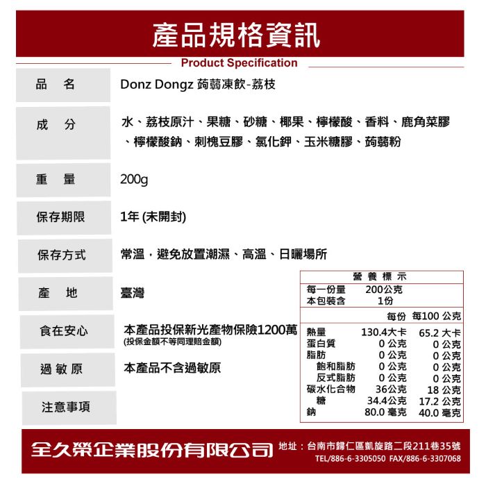 | 內容物(完整成份/食品添加物) | 水、果糖、椰果、砂糖、荔枝原汁、檸檬酸、香料、檸檬酸鈉、鹿角菜膠、氯化鉀、蒟蒻粉、玉米糖膠、刺槐豆膠 |