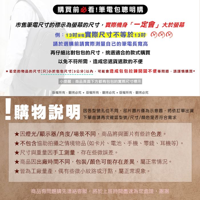 !請購買前先測量自己所需物品是否適宜裝入背包! 本產品不提供試用,7天「鑑賞期」非「試用期」。除非是新品瑕疵問題,拆封後無法辦理退貨。欲辦理退貨之商品必須是全新完整、未拆封之包裝狀態(含商品本體、贈品、原包裝袋、盒、箱、隨貨文件)。 |