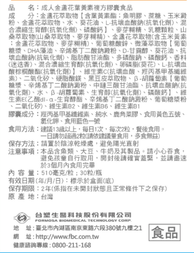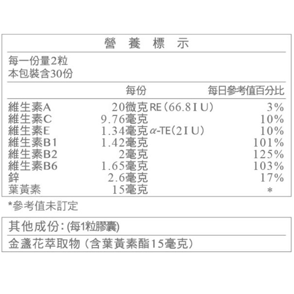 | 營養標示 | (每一份量 2 粒) 維生素A 20微克RE(66.8IU),維生素C 9.76毫克,維生素E 1.34毫克α-TE(21U),維生素B1 1.42毫克,維生素B2 2毫克,維生素B6 1.65毫克,鋅2.6毫克,葉黃素15毫克。*參考值未訂定。 |