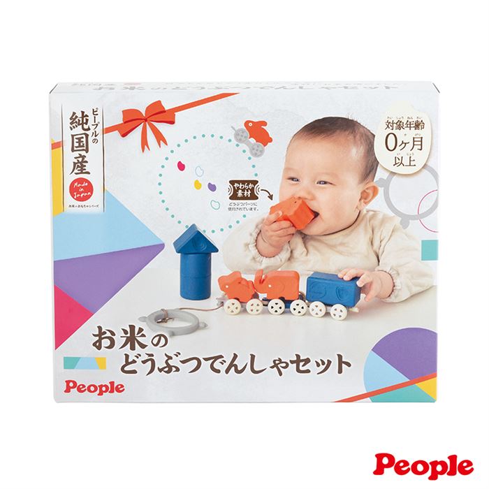 | 內容物 | 米的列車玩具3台、米的圓環玩具1個、動物造型配件(柔軟)3個、米積木(三角柱/圓柱/長方體)3個。 ※米的圓環及1台米的列車為綁好的狀態,列車連結是以卡榫方式組合,向外拉即可拆開。 |
