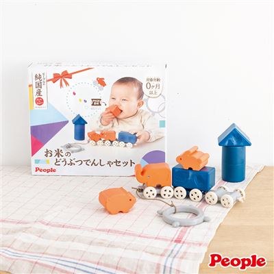 米的列車玩具3台、米的圓環玩具1個、動物造型配件(柔軟)3個、米積木(三角柱/圓柱/長方體)3個。