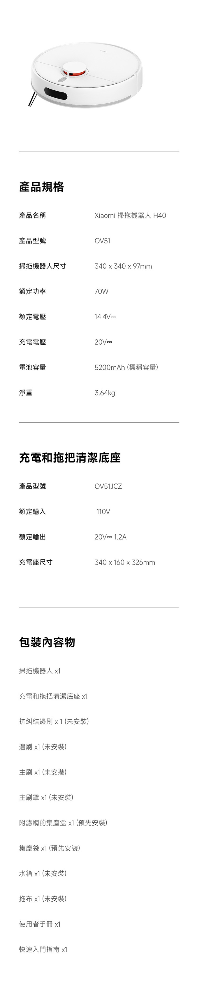 | 商品名稱 | Xiaomi 掃拖機器人 H40 |
