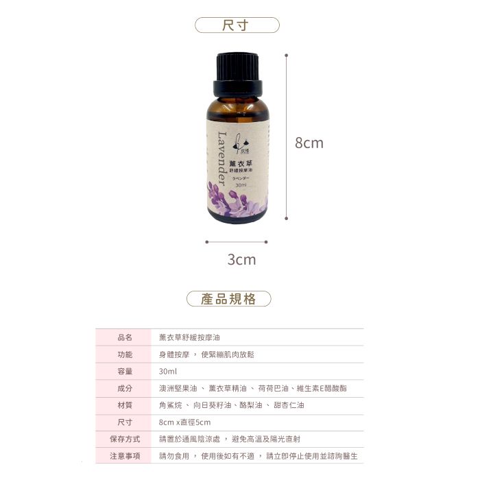 | 商品名稱/包裝內容規格 | 妝漾 薰衣草舒緩按摩油Lavender+妝漾 推脂拍打手套 |