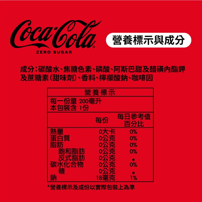 | 內容物(完整成份/食品添加物) | 碳酸水、焦糖色素、磷酸、阿斯巴甜及醋磺內酯鉀及蔗糖素(甜味劑)、香料、檸檬酸鈉、咖啡因。苯酮尿症患者(Phenylketonurics)不宜飲用。 |