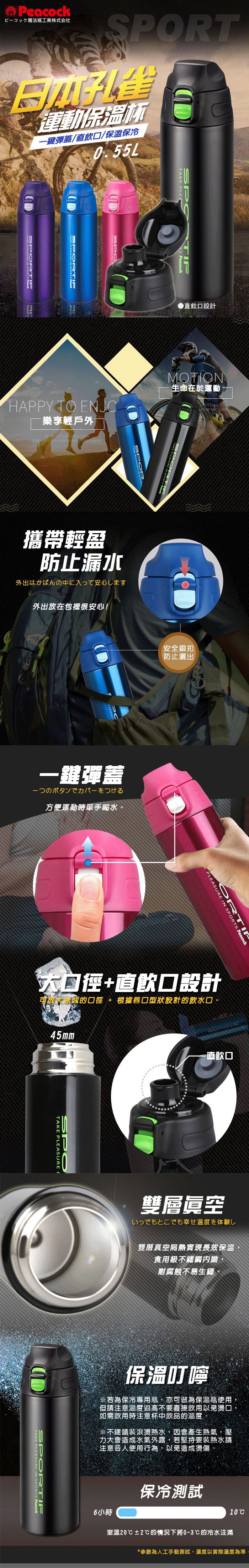 | 商品名稱 | 【日本孔雀Peacock】運動暢快直飲不鏽鋼保冷專用保溫杯550ML(直飲口設計)-桃紅 |