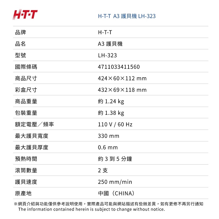 | 商品名稱 | H-T-T A3 護貝機 LH-323 |