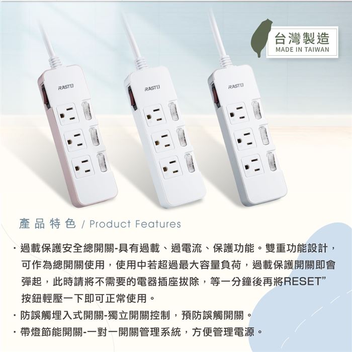 .雙重功能設計,可作為總開關使用,使用中若超過最大容量負荷,過載保護開關即會彈起,此時請將不需要的電器插座拔除,等一分鐘後再將RESET"按鈕輕壓一下即可正常使用