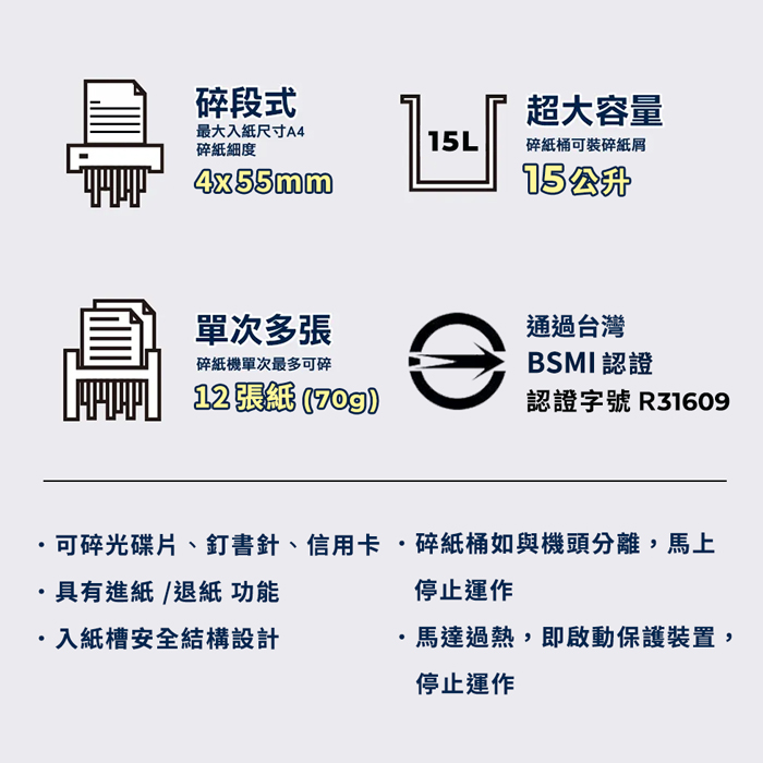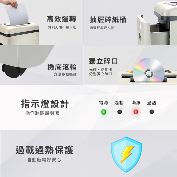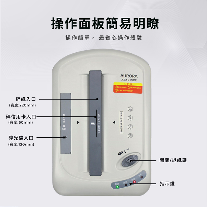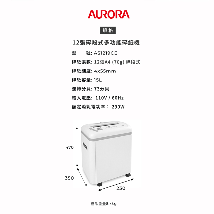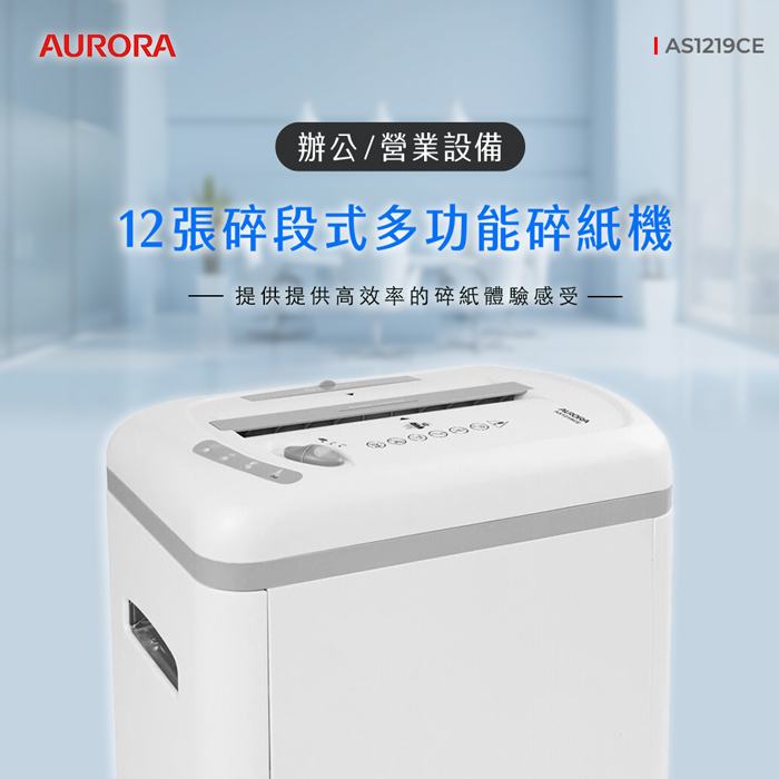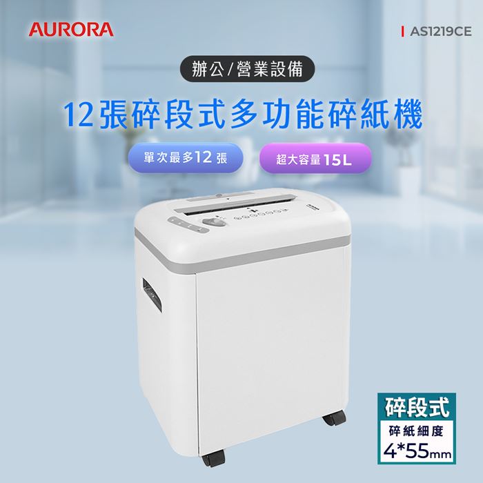 | 商品名稱 | AURORA 震旦 15L 12張碎段式多功能碎紙機AS1219CE |