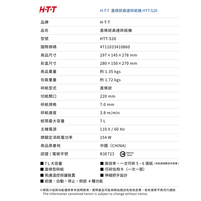 | 商品名稱 | H-T-T 長條型高速碎紙機 HTT-S20 |