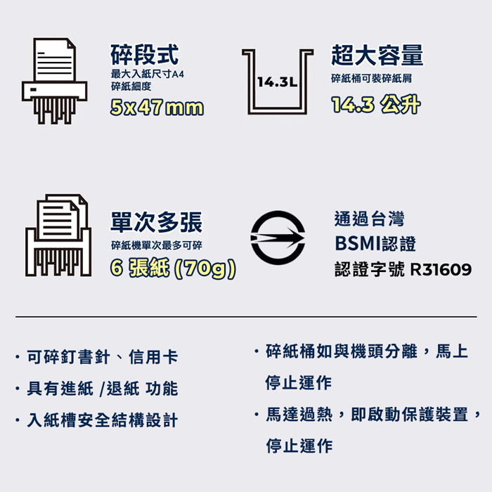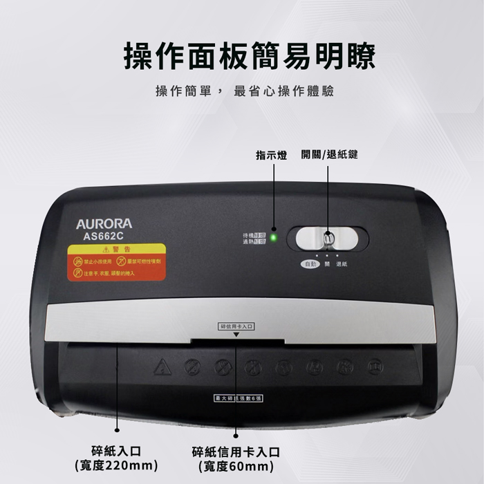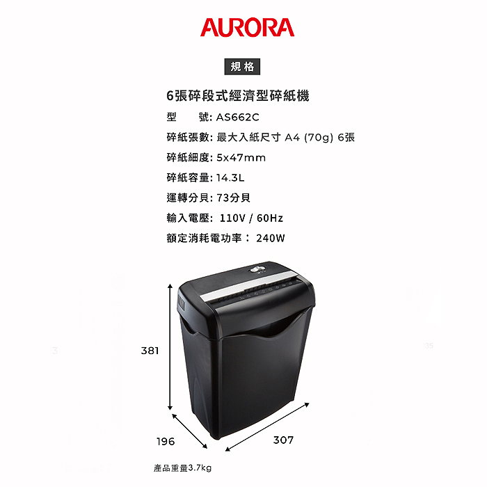 | 商品名稱 | AURORA 震旦 14.3L 6張碎段式經濟型碎紙機 AS662C |