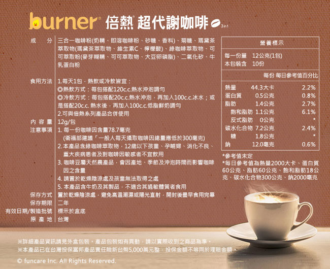 | 包裝內容/商品規格 | 船井burner倍熱超代謝咖啡10包*3盒 |