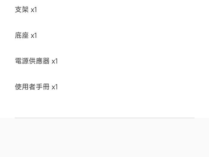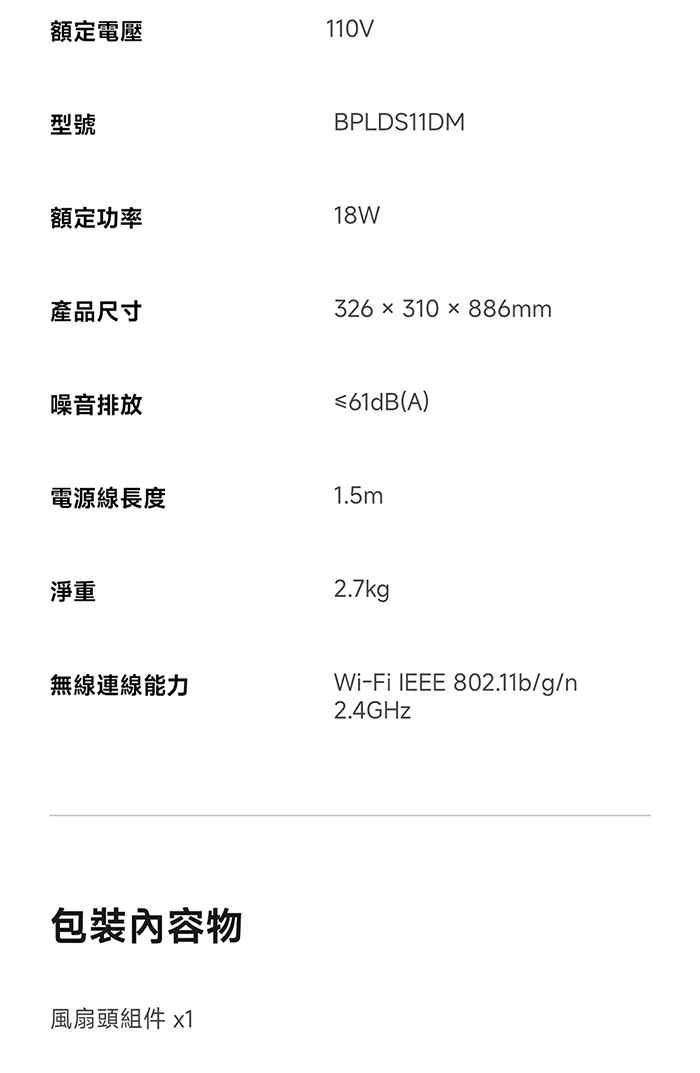 | 內容物 | 風扇頭組件 x1 支架 x1 底座 x1 電源供應器 x1 使用者手冊 x1 |