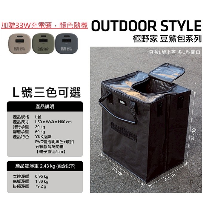 | 【商品名稱】 | 【+886極野家】好好收納豆鯊包(L)-三色可選[加贈33W氮化稼充頭] |