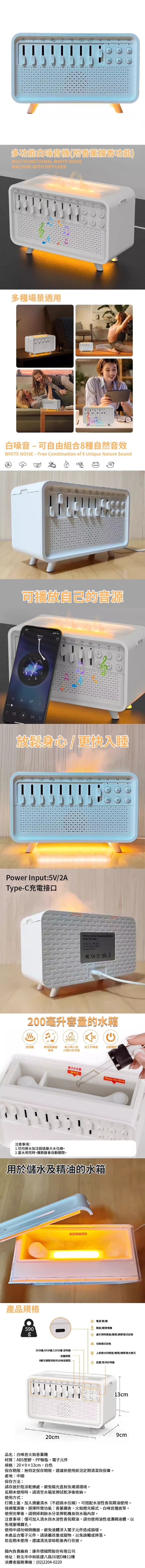 | 注意事項 | 僅可加入清水與水溶性香氛精油,請勿使用油性或濃稠液體,以免堵塞噴霧孔。 使用中請勿傾倒機器,避免液體滲入電子元件造成損壞。 本產品含電子元件,請遠離孩童或寵物,以免誤觸或摔落。 若長期未使用,建議清洗並晾乾後再行存放。 |