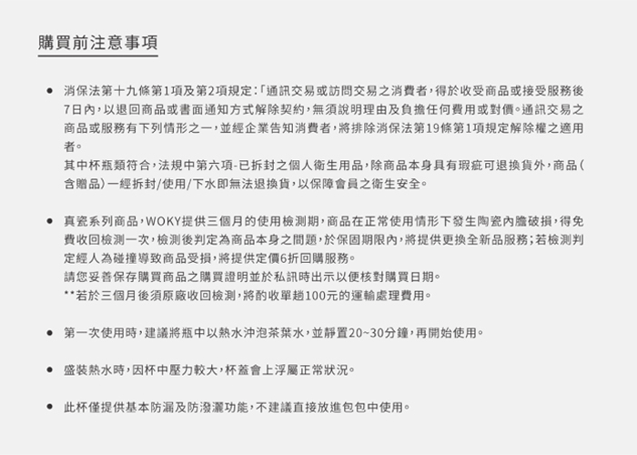 消保法第十九條第1項及第2項規定 : 「通訊交易或訪問交易之消費者,得於收受商品或接受服務後7日內,以退回商品或書面通知方式解除契約,無須說明理由及負擔或對價。通訊交易之商品或服務有下列情形之一,並經企業告知消費者,將排除消保法第19條第一項規定解除權之適用者。 其中杯瓶類符合,法規中第六項 - 已拆封之個人衛生用品,除商品本身具有瑕疵可退換貨外,商品 (含贈品) 一經拆封 / 使用 / 下水即無法退換貨,以保障會員之衛生安全。 |