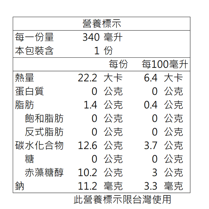 | 營養標示 | 每一份量340毫升,本包裝含1份。蛋白質0公克、脂肪1.4公克、飽和脂肪0公克、反式脂肪0公克、碳水化合物12.6公克、糖0公克、赤藻糖醇10.2公克、鈉11.2毫克。 |