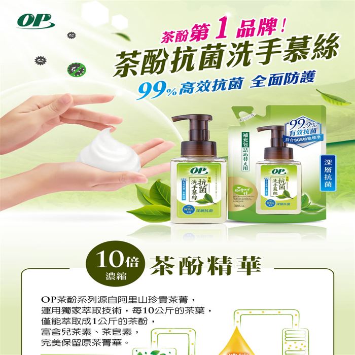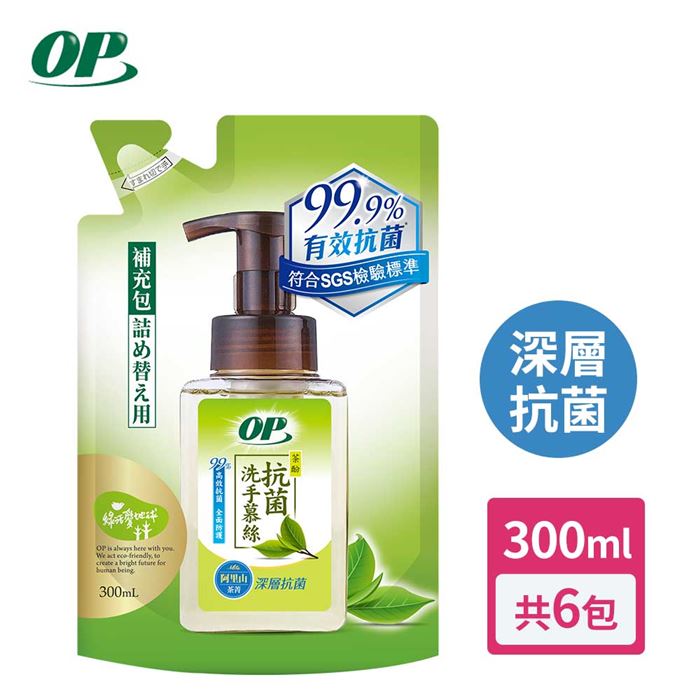 | 商品名稱/包裝內容規格 | 【OP】天然茶酚洗手慕絲補充包-深層抗菌型 300mlx6包 |