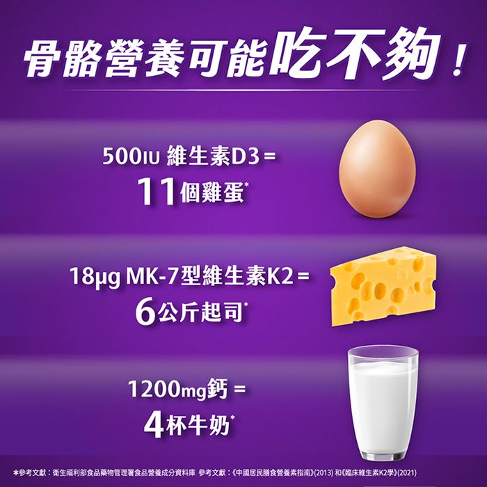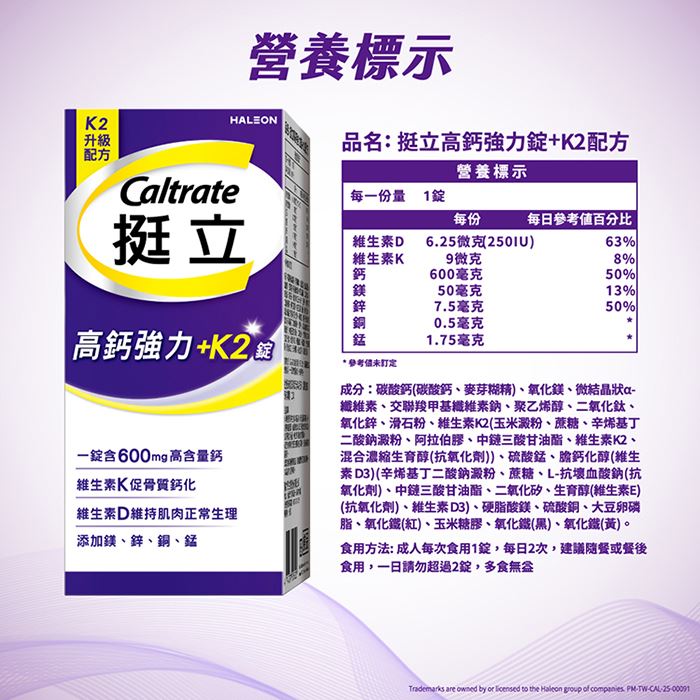 | 內容物 (完整成份/食品添加物) | 碳酸鈣(碳酸鈣、麥芽糊精)、氧化鎂、微結晶狀a-纖維素、交聯羧甲基纖維素鈉、聚乙烯醇、二氧化鈦、氧化鋅、滑石粉、維生素K2(玉米澱粉、蔗糖、辛烯基丁二酸鈉澱粉、阿拉伯膠、中鏈三酸甘油酯、維生素K2、混合濃縮生育醇(抗氧化劑))、硫酸錳、膽鈣化醇(維生素D3)(辛烯基丁二酸鈉澱粉、蔗糖、L-抗壞血酸鈉(抗氧化劑)、中鏈三酸甘油酯、二氧化矽、生育醇(維生素E)(抗氧化劑)、維生素D3)、硬脂酸鎂、硫酸銅、大豆卵磷脂、氧化鐵(紅)、玉米糖膠、氧化鐵(黑)、氧化鐵(黃)。 |