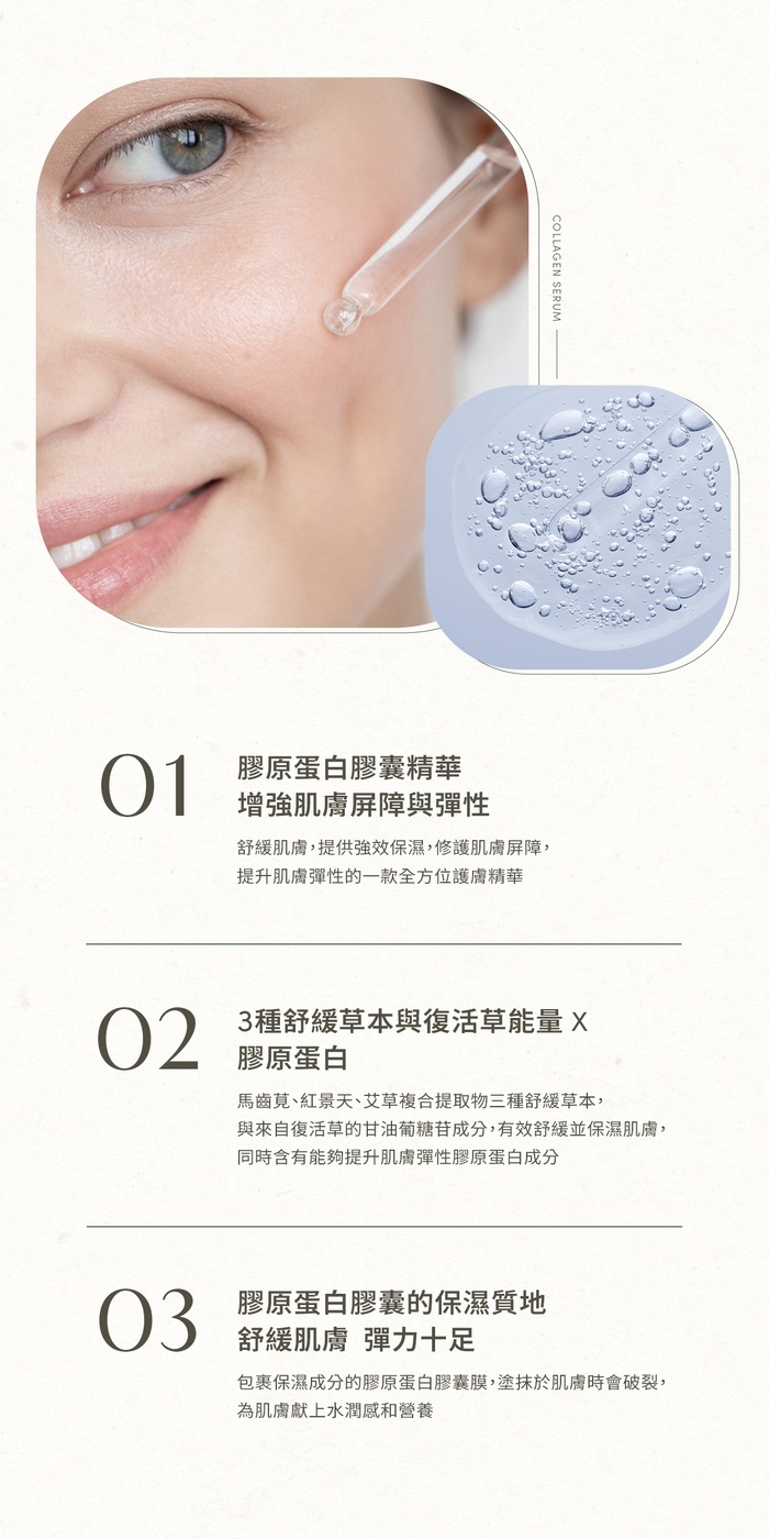 保濕屏障三合一,舒緩肌膚 彈力十足